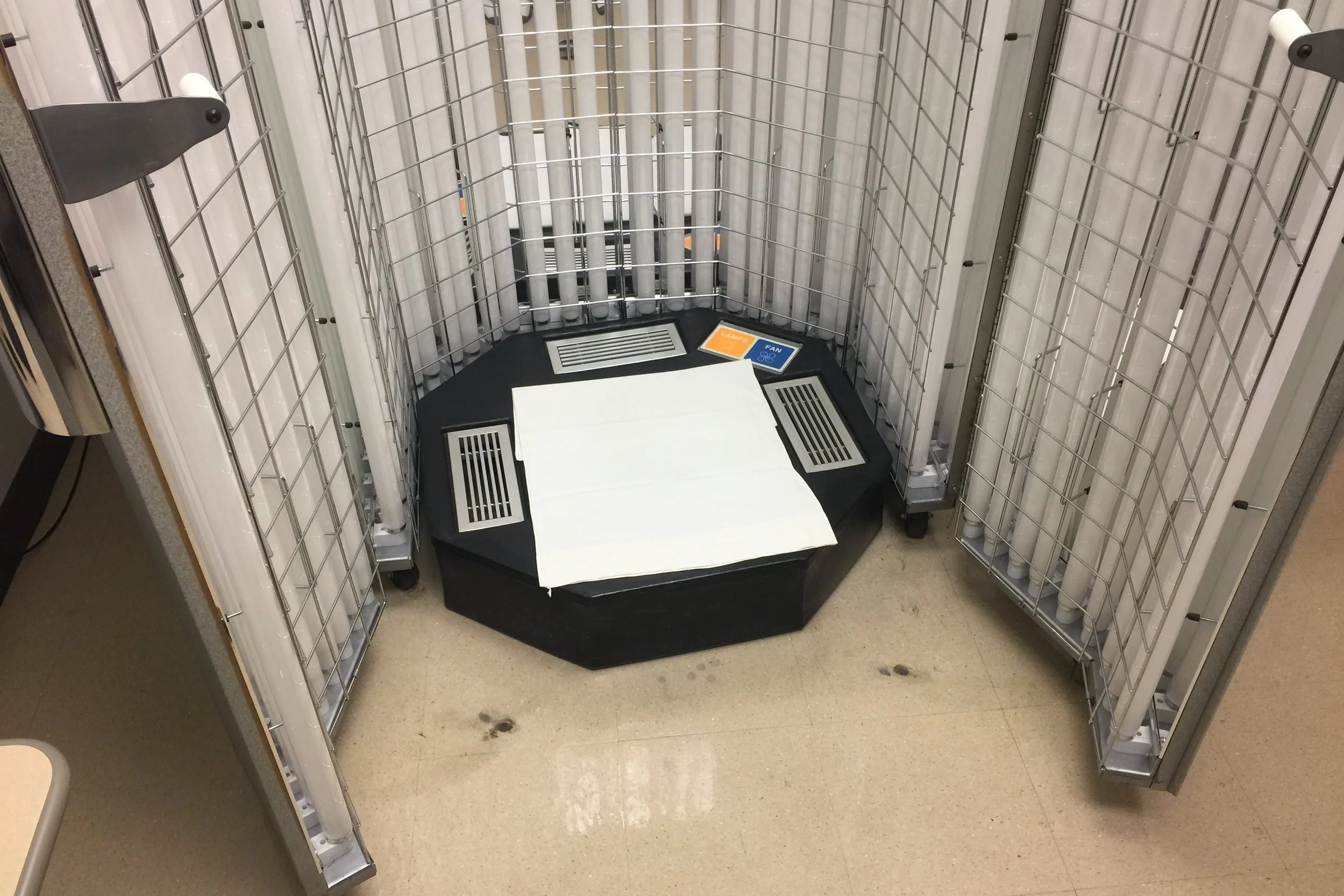 So the booth above would be difficult for someone in a wheel chair or using other mobility devices. At the Vanderbilt Dermatology Clinic in Nashville, TN, they also have a phototherapy booth with a removable platform and doors that open wider to allow a patient using mobility devices to use this therapy. See the photo below.