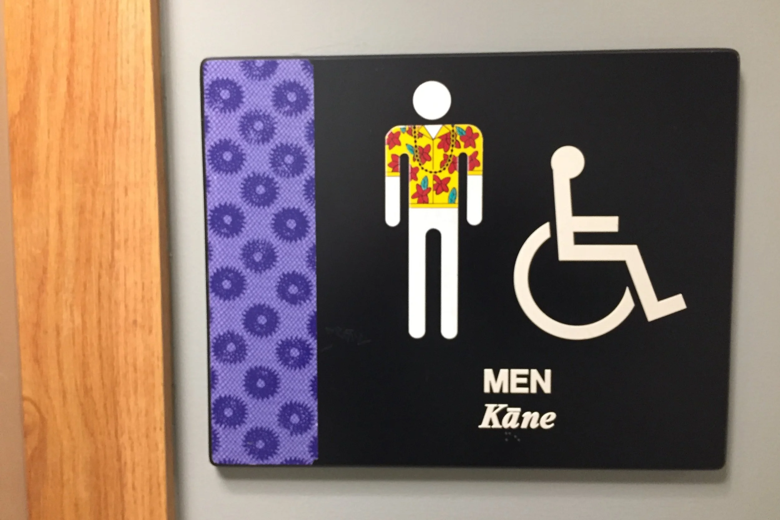 In our black and white and blue ADA world, it is interesting to find some other presentations for the pictogram component of ISA signs at toilet rooms. The photo below is the Men’s Toilet Room ISA sign at the Honolulu Airport where the male pictogram is wearing a Hawaiian print aloha shirt. I found this while on a recent blogging trip
