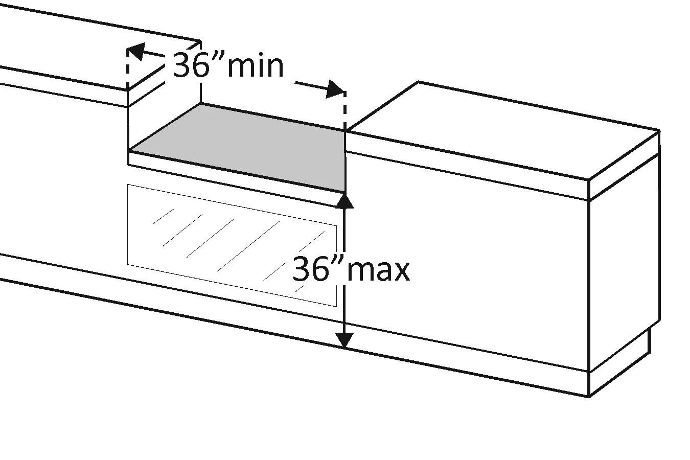 2010 ADA Standard 904.4.1, [Sales and Service Counters] Parallel Approach, states, “A portion of the counter surface that is 36 inches (915 mm) long minimum and 36 inches (915 mm) high maximum above the finish floor shall be provided. A clear floor or ground space complying with 305 shall be positioned for a parallel approach adjacent to the 36 inch (915 mm) minimum length of counter. EXCEPTION: Where the provided counter surface is less than 36 inches (915 mm) long, the entire counter surface shall be 36 inches (915 mm) high maximum above the finish floor.” The graphic below is representative of this requirement.