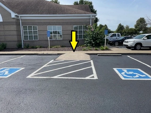 Another violation of the ADA is the curb ramp installed at the parking area intended to be accessible. Please look at the photo below. You are looking at the two ADA accessible parking spaces with a shared accessible aisle that connects to a walkway leading to the bank pedestrian public entry/exit door. Focusing on the curb ramp at the end of the access aisle [yellow arrow], what’s wrong? HINT: ADA accessible parking spaces and aisles must have level surfaces.